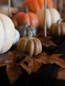 Use a trio of faux pumpkins in graduated sizes (e.g. the rustic orange & one white) as focal points.