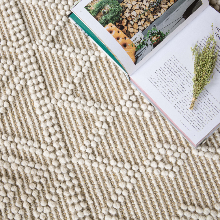 A stunning, flatwoven handwoven sand rug, featuring a bobble pattern