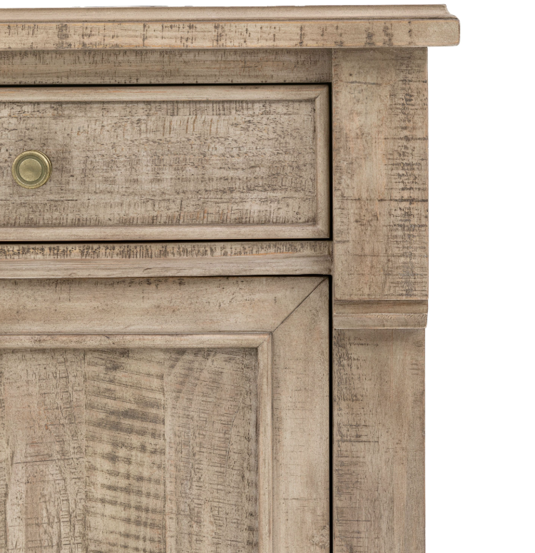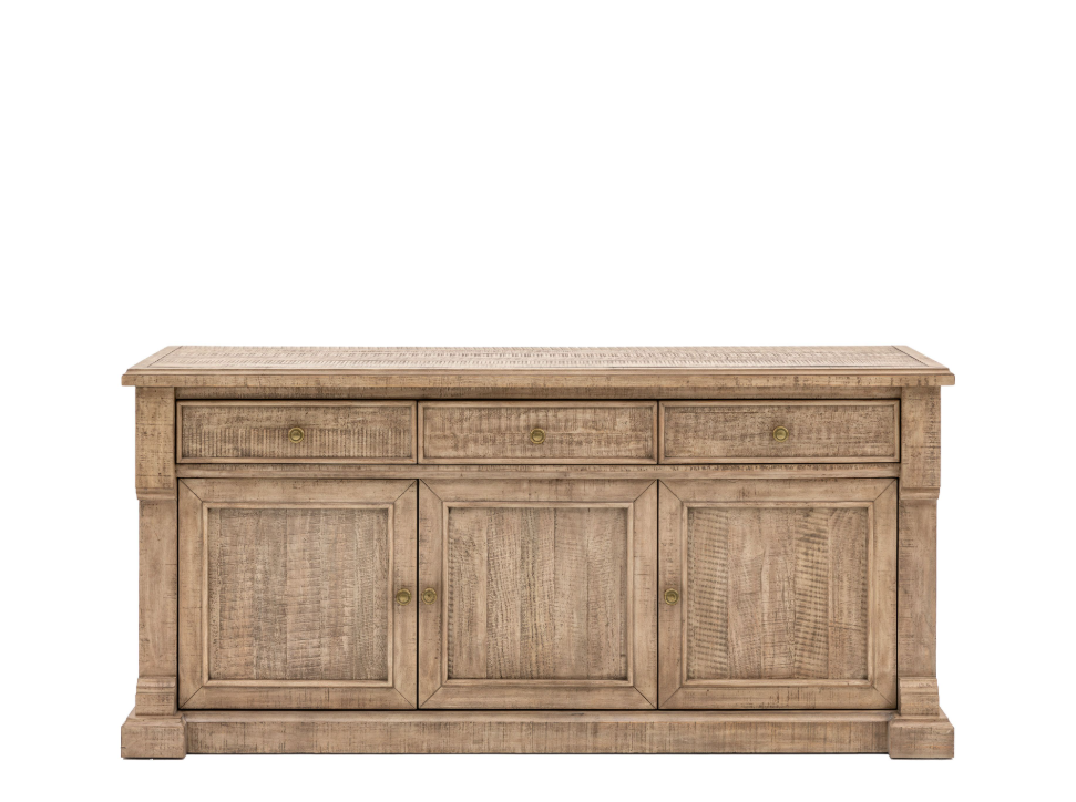 Featuring three spacious drawers and three cabinet doors, the Oakridge sideboard offers ample storage for dinnerware, linens, or living room essentials. The hand-finished texture and antique brass knobs enhance its vintage-inspired look, making it an ideal statement piece for your dining room, entryway, or living area.