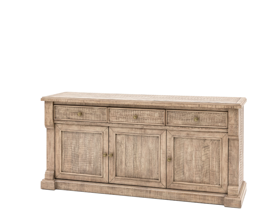 Add timeless charm and functional storage to your home with the Rustic Oakridge 3-Drawer Sideboard. Crafted from pine with a natural weathered finish, this beautifully designed sideboard showcases classic detailing and a rustic aesthetic that complements farmhouse, cottage, and traditional interiors.