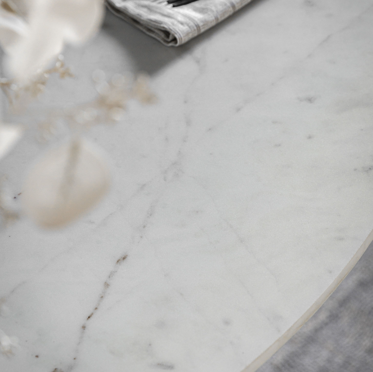 Experience the refined elegance of this exquisite dining table, crafted from luxurious solid mango wood. Its unique design features a striking vertical ribbed pattern on the drum base, topped with a polished Indian white Carrera marble surface adorned with classic grey/blue veins. Complete the look with our matching pieces.