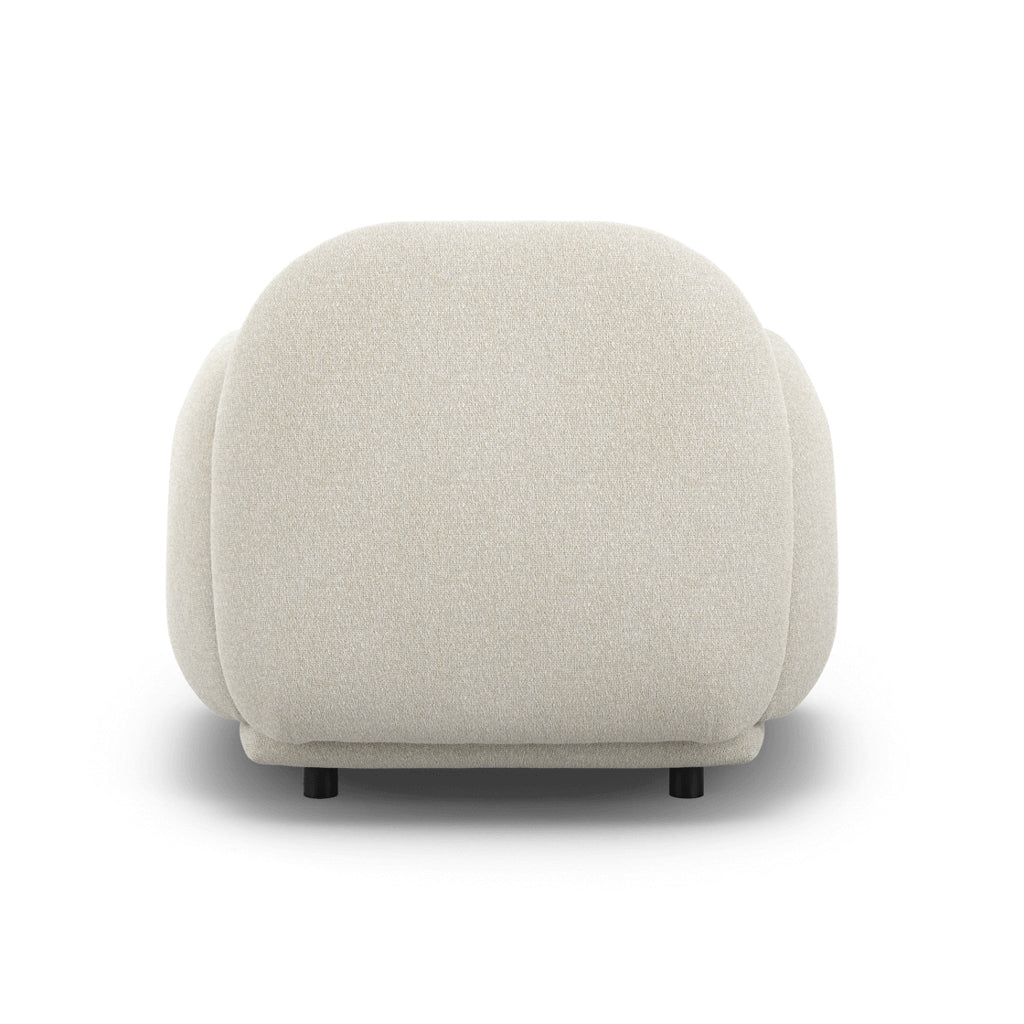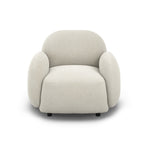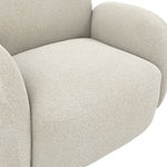 The Sloane chair features a curved design with weave fabric upholstery and plump cushions, offering both comfort and style.