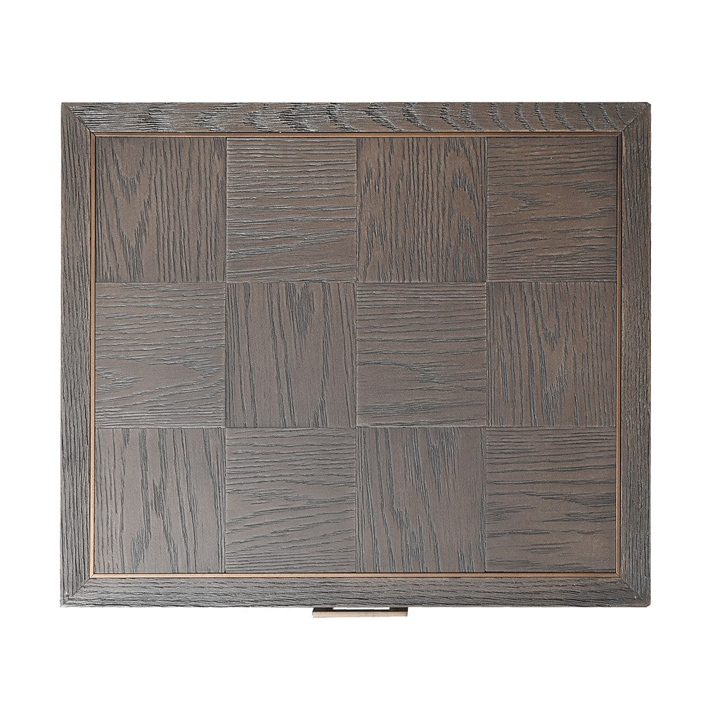 Elevate your bedroom décor with this stylish modern oak bedside table, expertly crafted from high-quality wood and finished in a sophisticated grey oak tone. Featuring two spacious drawers, this nightstand offers ample storage for your night time essentials, keeping your space organized and clutter-free. The standout design includes a sleek checkerboard wood grain pattern on the drawer fronts, complemented by elegant square brass handles and matching brass-capped legs for a touch of luxury.