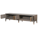 A gray TV unit with brass handles and a textured surface, with closed cabinets on the left and an open shelf on the right, supported by tapered legs.