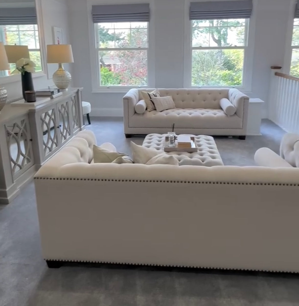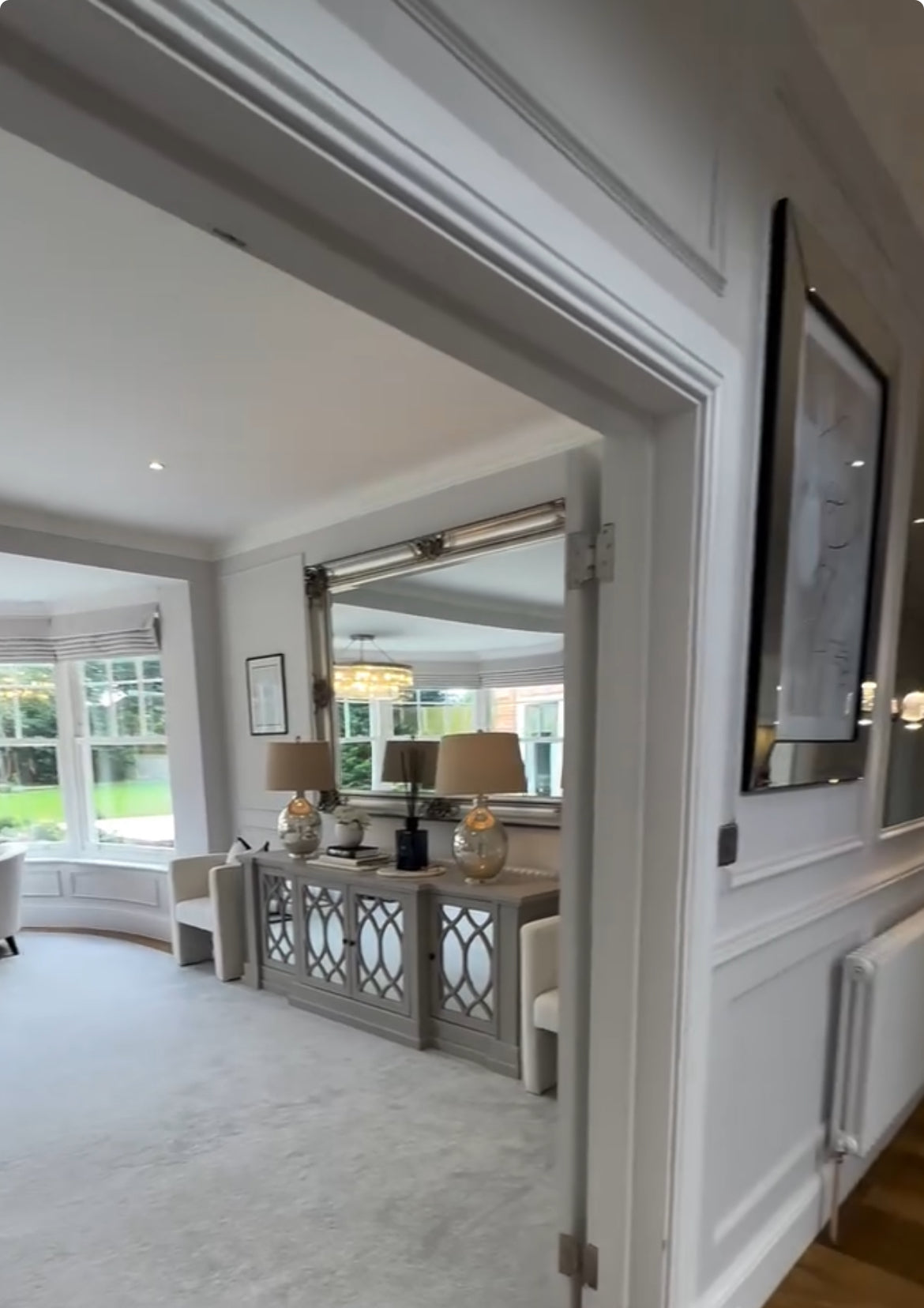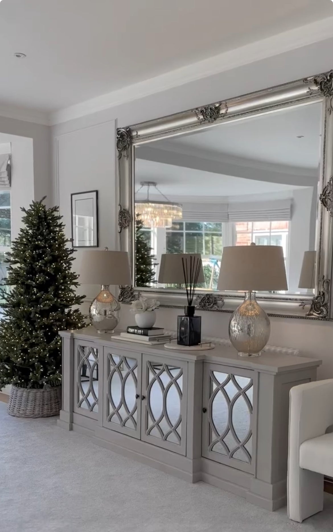 The mirrored doors feature intricate overlaid lattice detailing, reflecting light beautifully to enhance your space’s ambiance. Inside, generous shelving provides ample storage for dinnerware, glassware, or everyday essentials. Whether used as a dining room buffet, living room console, or hallway statement piece, The Erin Sideboard adds refined style and functional beauty to any interior.