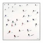 Indulge in a visual feast with this lively depiction of a bustling ski slope. The powdery mountainside radiates under the afternoon sun as skilled snow carvers leave their mark. Robert Lachapelle's artistic eye captures the vibrant ski fashion in this high gloss acrylic artwork, framed in sleek silver.