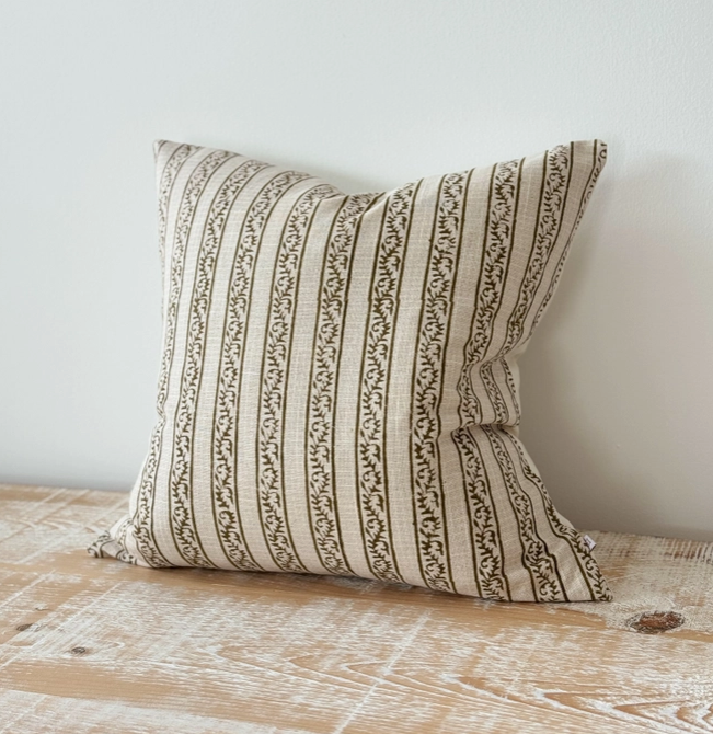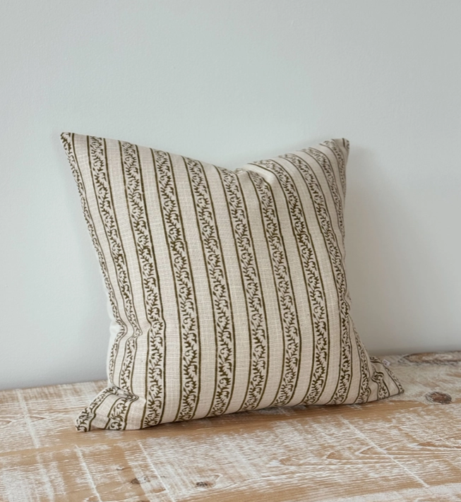 Bring refined pattern and natural warmth to your interior with the Farrow Olive Stripe poly cotton cushion cover. Featuring soft olive stripes with an elegant decorative motif on a natural base, this cushion cover adds texture and subtle character while remaining easy to style.