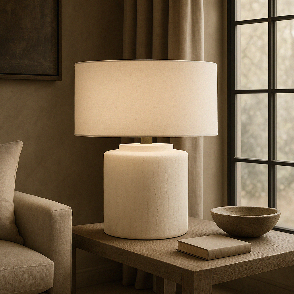 Bring a touch of luminosity into your home with our Penelope White Textured Ceramic Table Lamp. Whether you're curled up with a book, seeking refuge from a summer storm, or starting your day before sunrise, this beautifully handcrafted lamp will be your companion, radiating light and uplifting your mood. The unique design features a ceramic base with a textured finish, and a simple yet elegant 100% cotton shade in off-white.