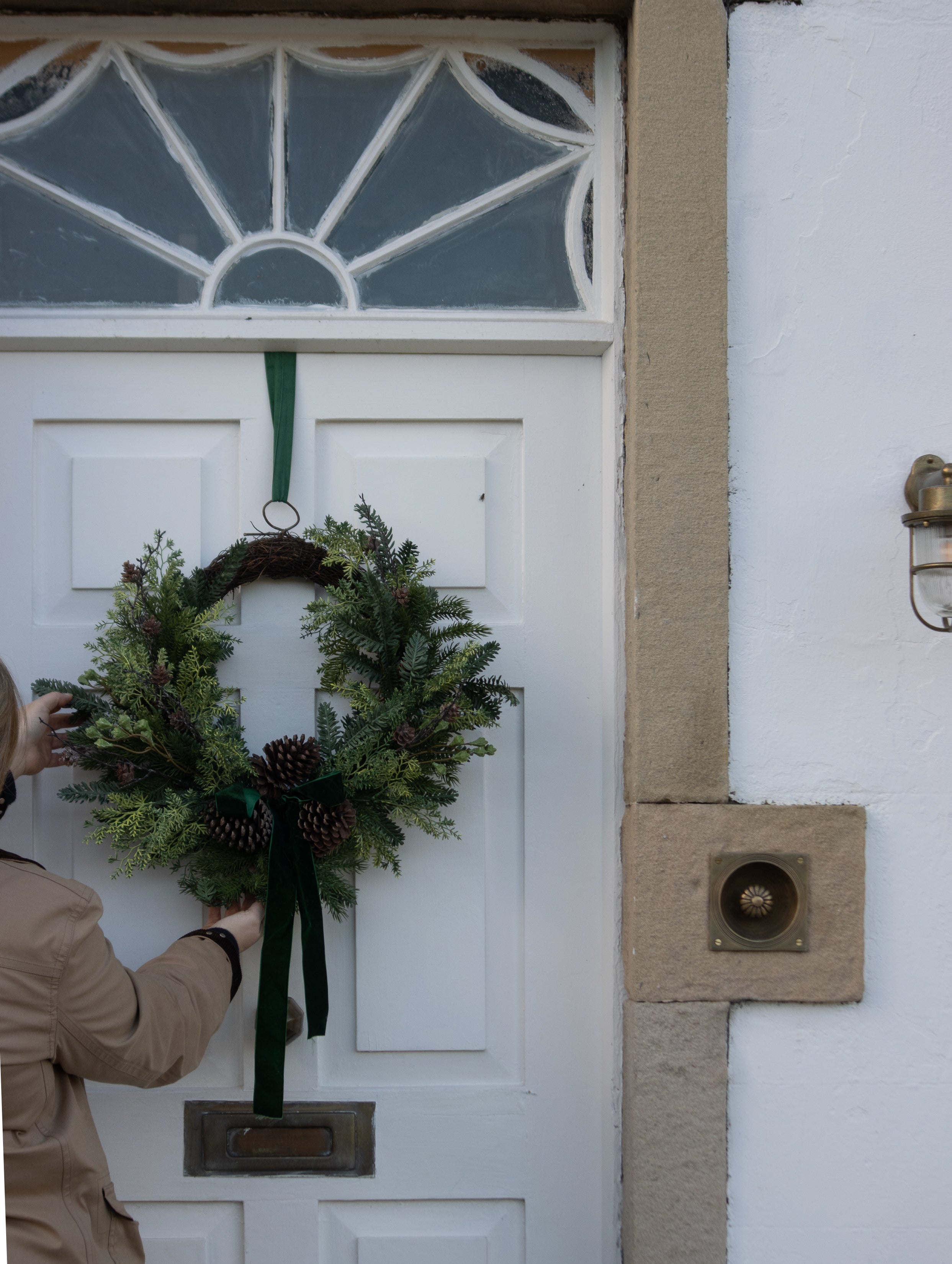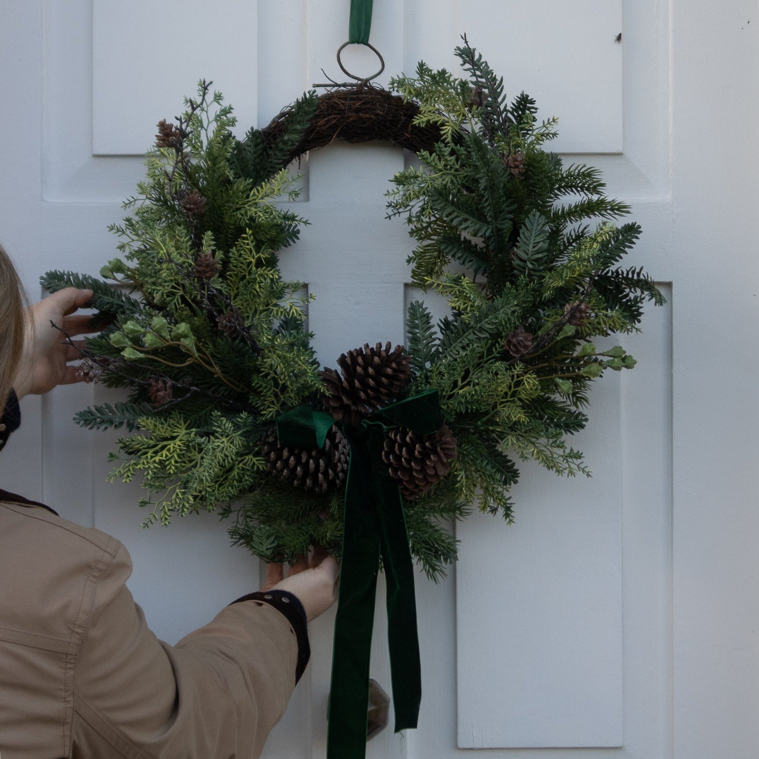Celebrate the holidays in timeless style with the Evergreen Christmas Wreath with Green Velvet Bow. Designed with lush faux greenery, natural pinecones, and an elegant velvet ribbon in deep green, this wreath brings a festive and inviting look to your home. Its classic circular design symbolises warmth and togetherness, making it a perfect addition to your holiday traditions.