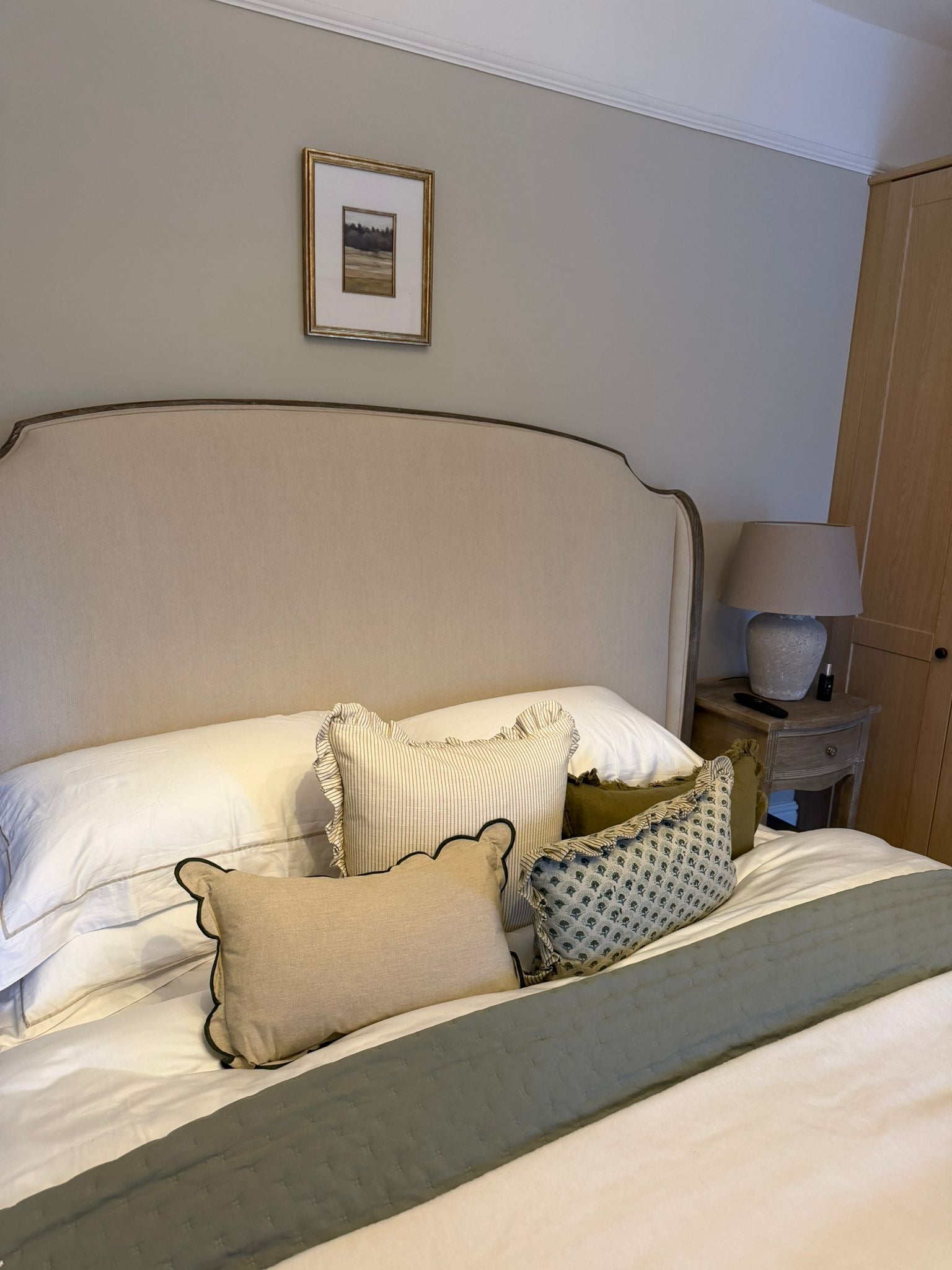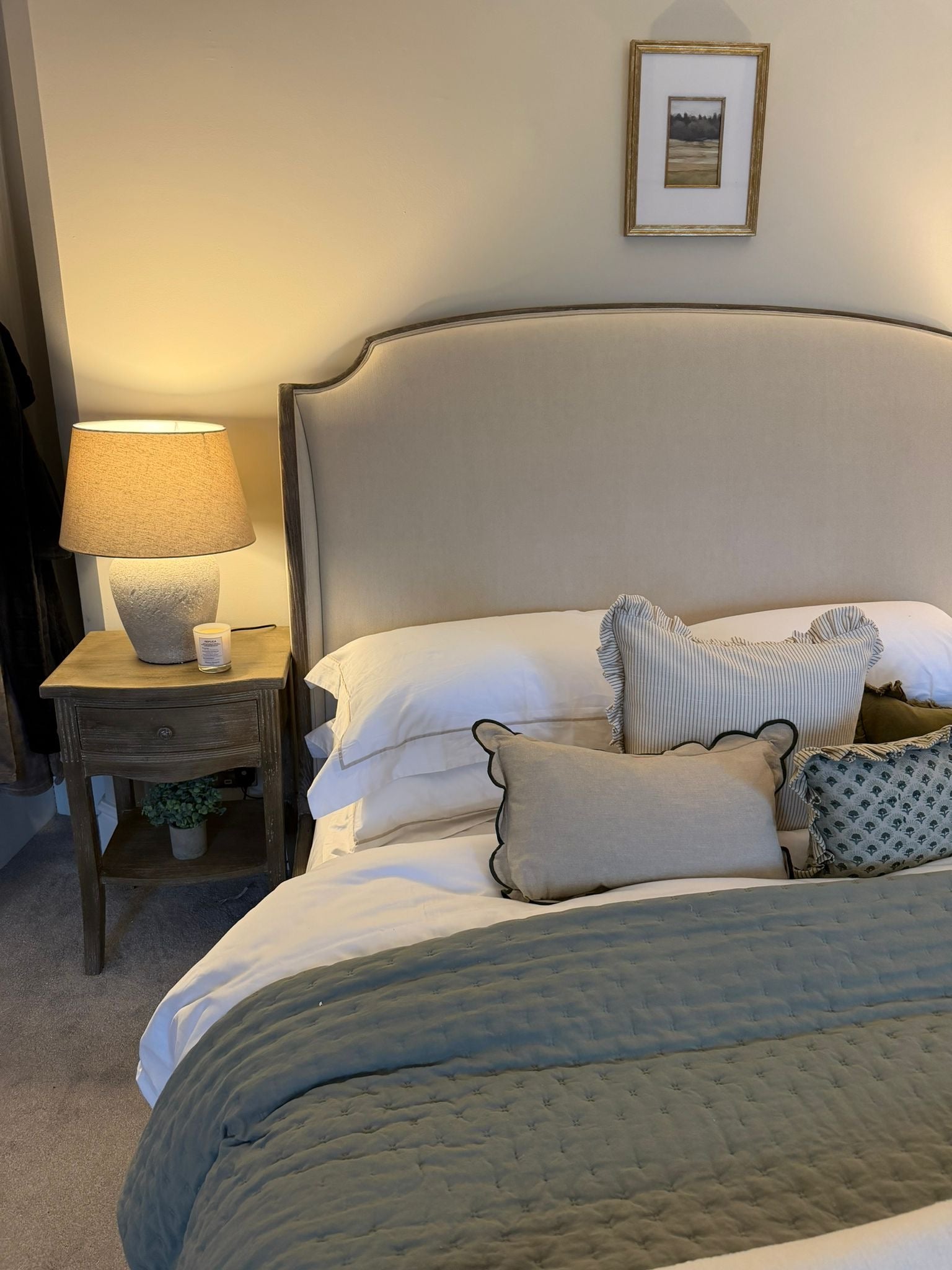 The gently curved headboard and footboard feature beautifully carved details, creating a refined silhouette that complements both traditional and contemporary interiors. The neutral linen upholstery blends seamlessly with any colour palette, making this bed a versatile and elegant centrepiece.