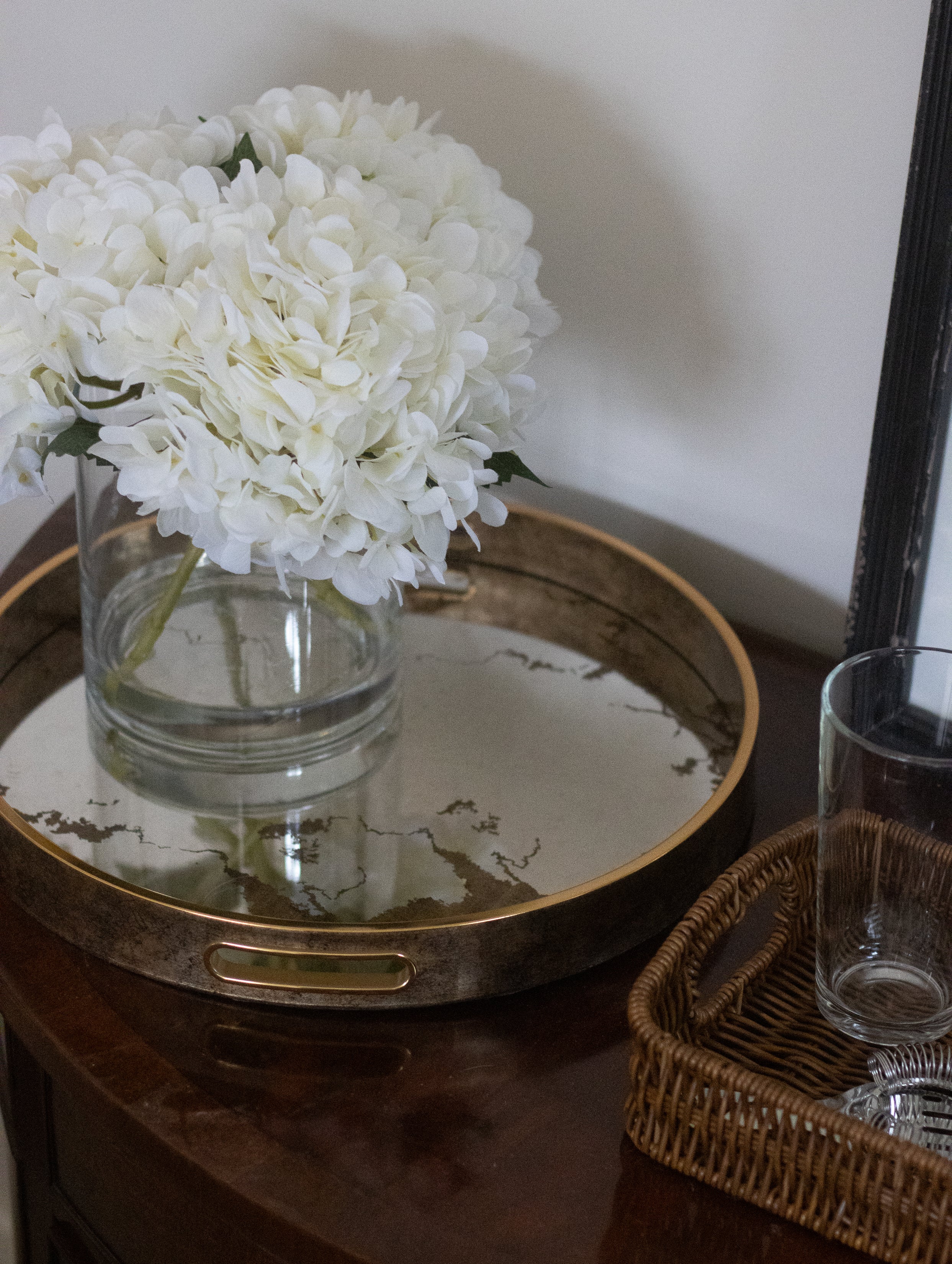 Faux white hydrangea arrangement in a clear glass vase with realistic stems and foliage