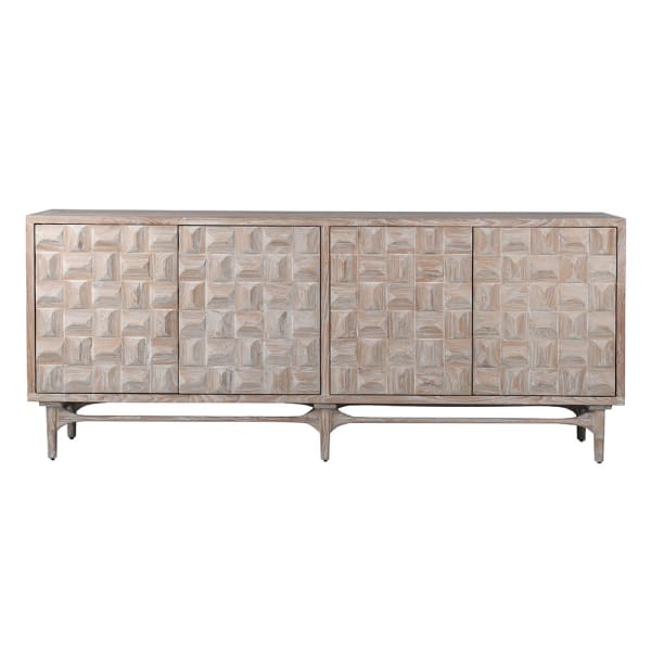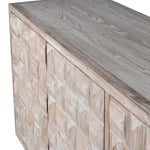 The Summit Elm Sideboard brings natural beauty and sculptural detail to your home. Handcrafted from solid elm wood, it features striking 3D geometric door carvings that echo the rugged textures of mountain landscapes. The soft whitewashed finish enhances the natural grain of the elm, blending rustic warmth with modern sophistication.