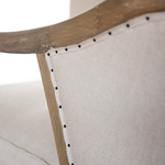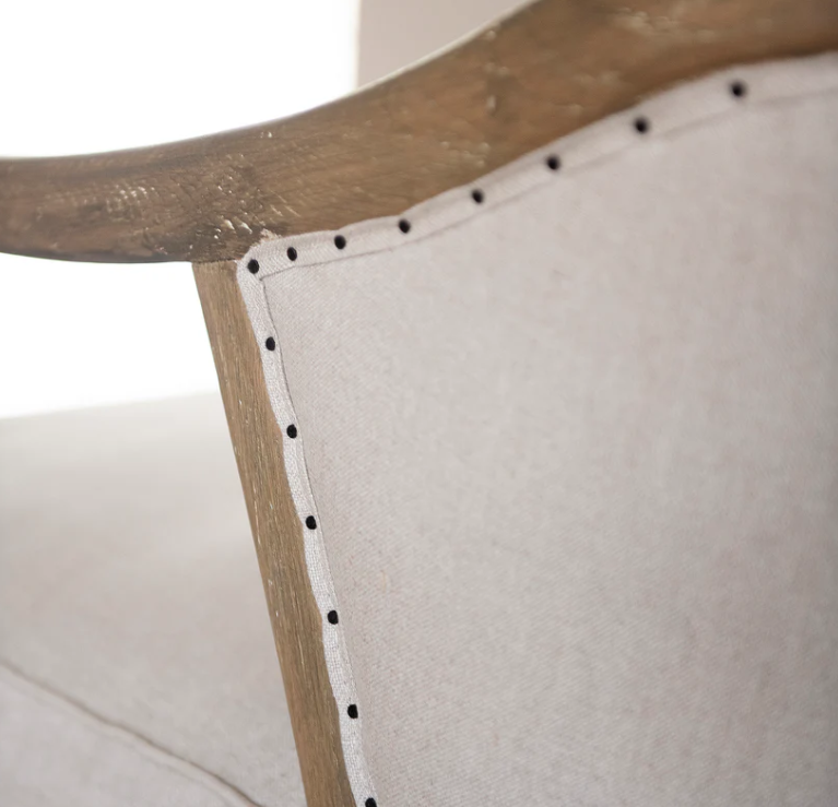 Decorative stud edging highlights the tailored silhouette, while the exposed wood grain adds a warm organic feel. The Langford armchair is ideal for living rooms, bedrooms, reading corners, and transitional spaces where style and comfort matter equally. With its neutral colour palette and timeless design, it blends seamlessly into coastal, farmhouse, modern, rustic, or classic interiors.