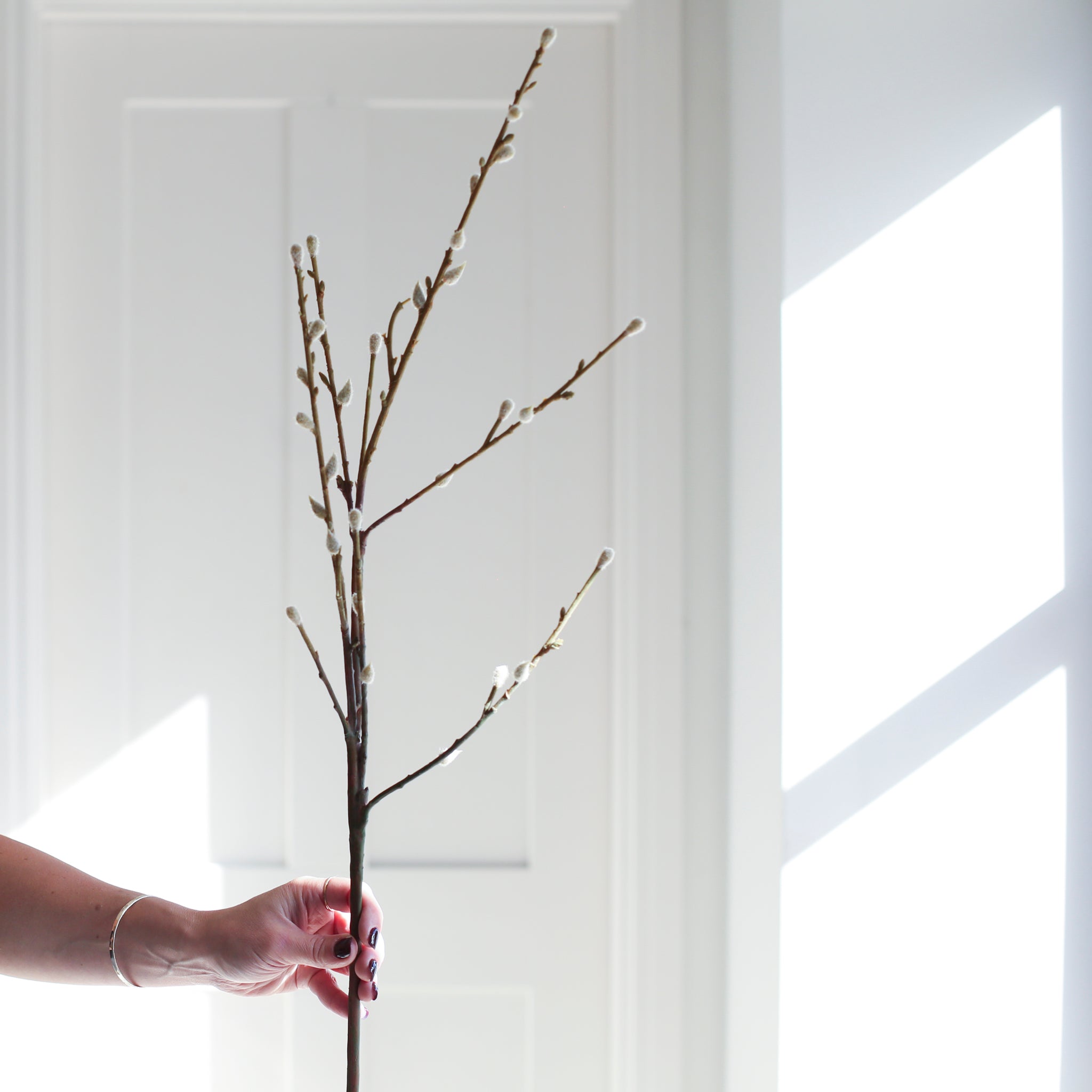 Charles Ted Pussy Willow Branch held in hand against white background with natural light
