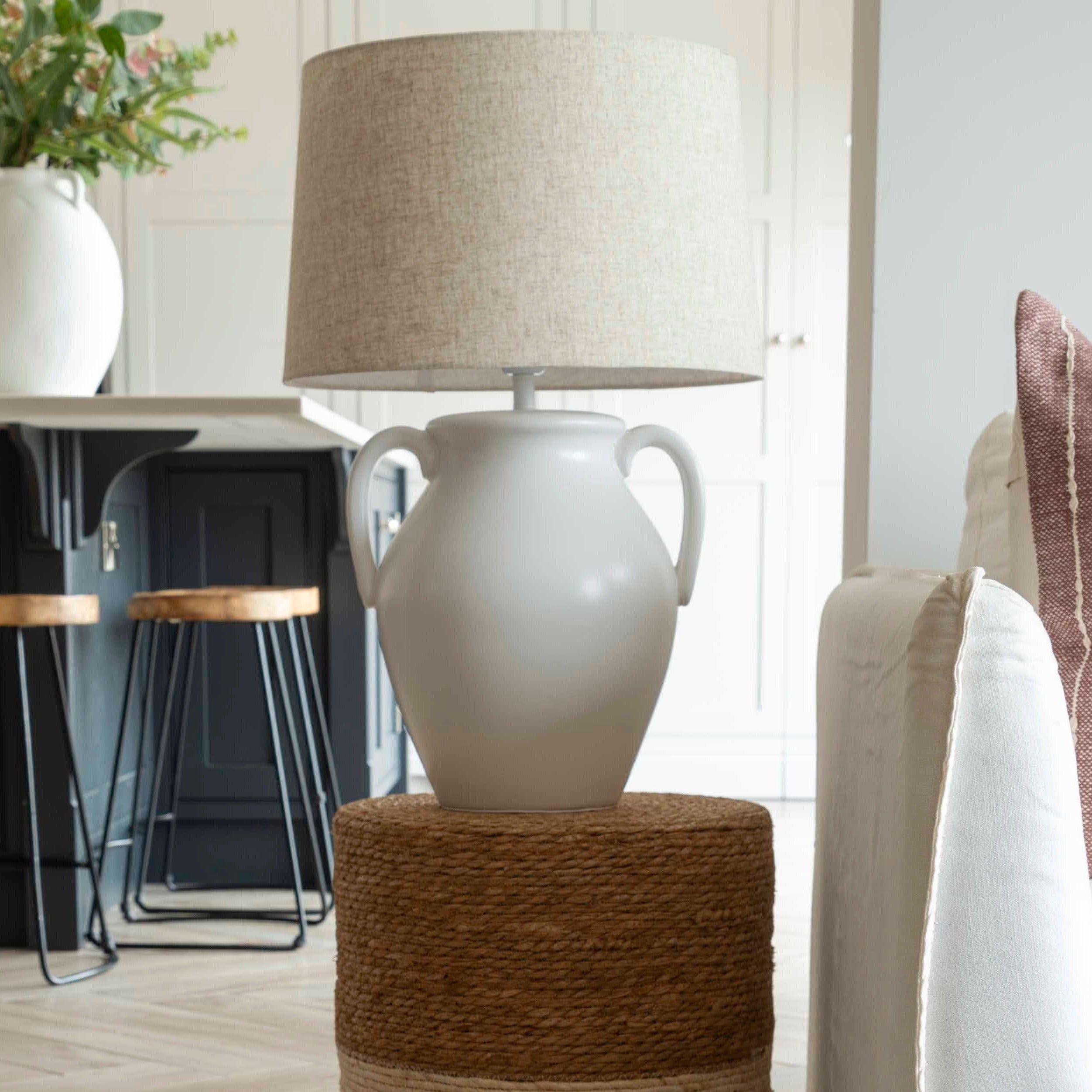 Modern urn-style ceramic lamp with linen shade in living room