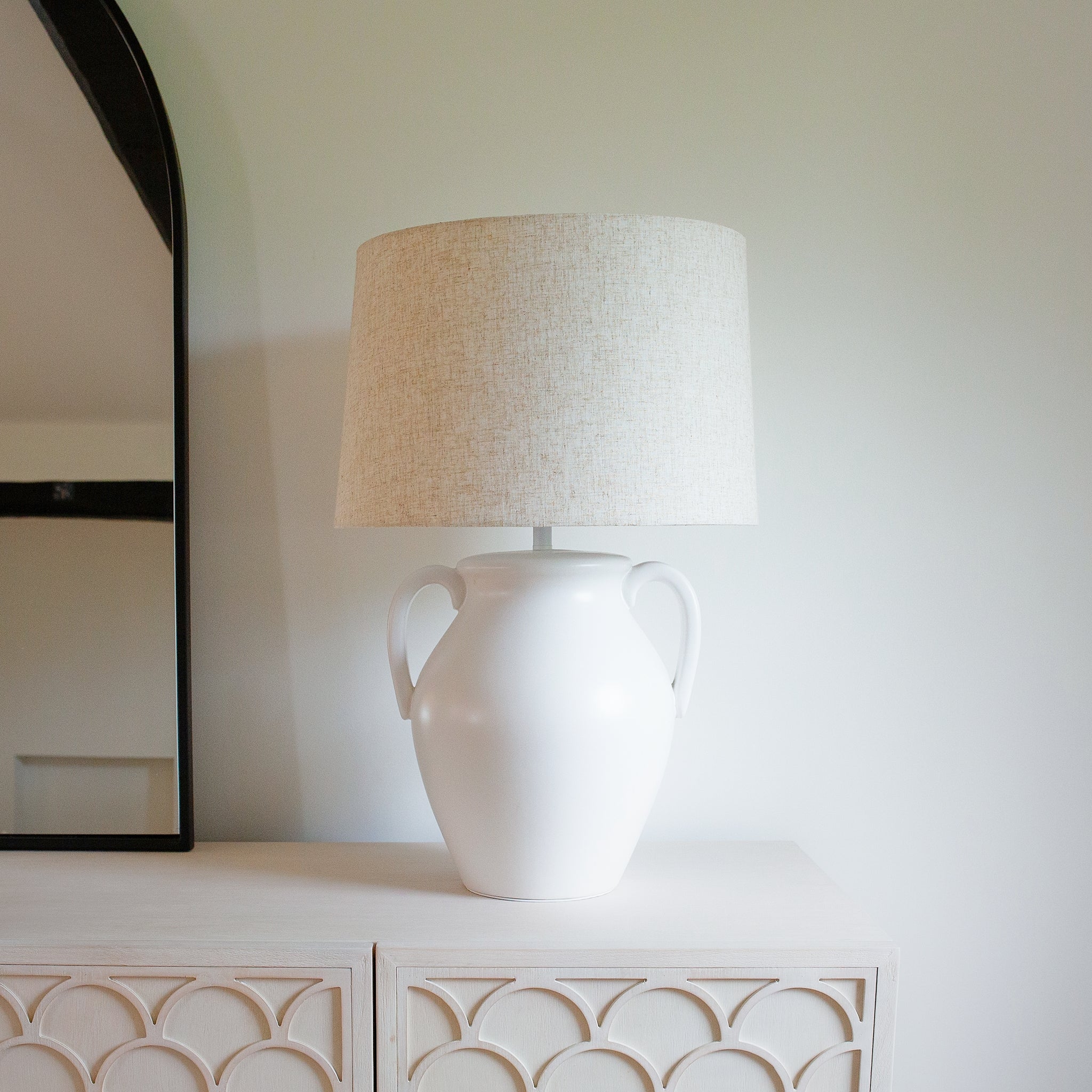 "White ceramic urn table lamp with linen shade on sideboard