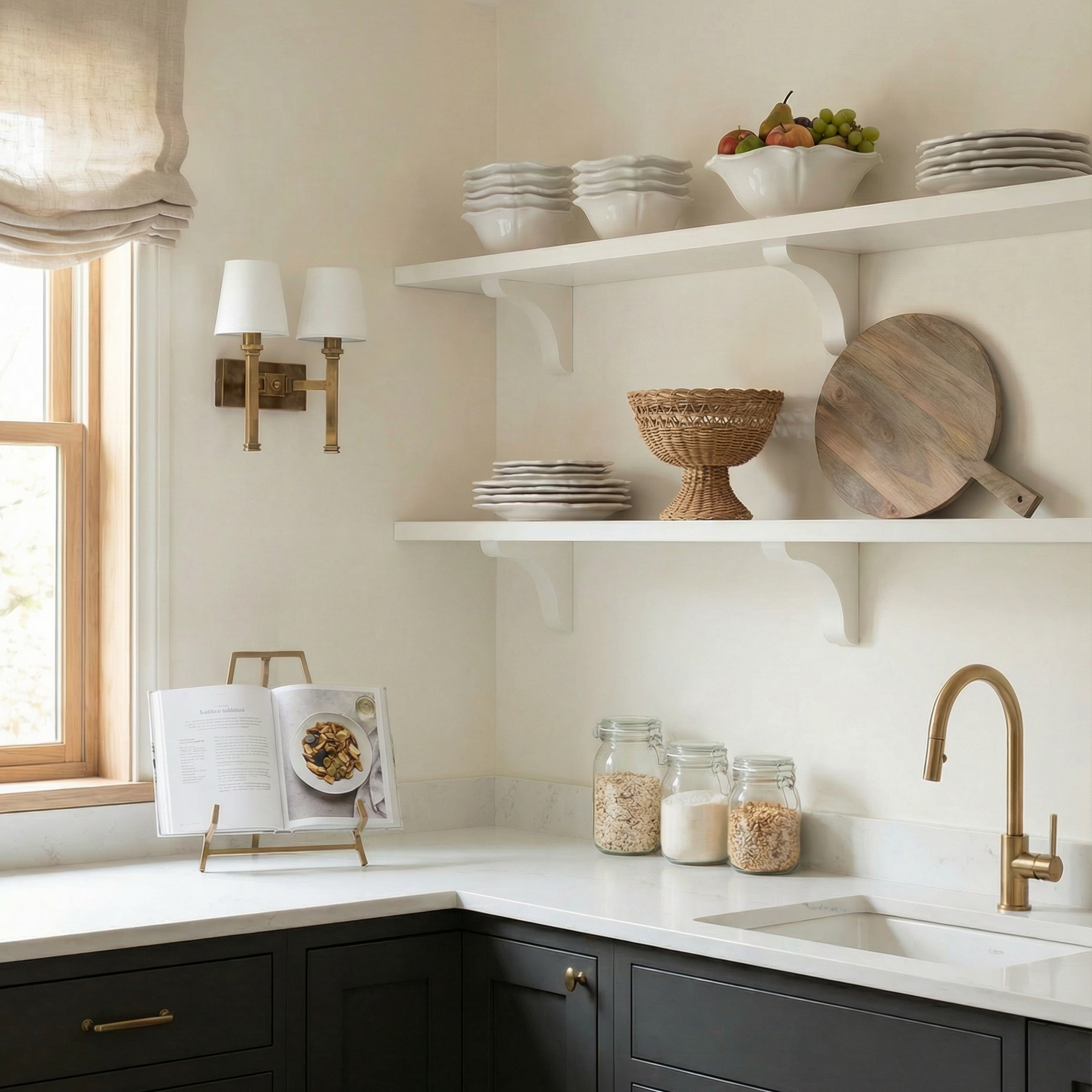 Open shelves across two columns — books, ceramics, artwork, botanicals and decorative objects