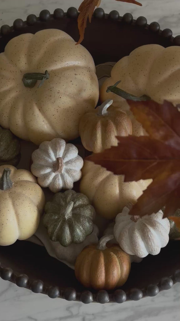 Bring the charm of autumn indoors with this set of decorative polyresin pumpkins. Designed in a natural rustic style, these pumpkins come in three timeless colours green, orange, and white making them a perfect accent for seasonal décor, table settings, or window displays.