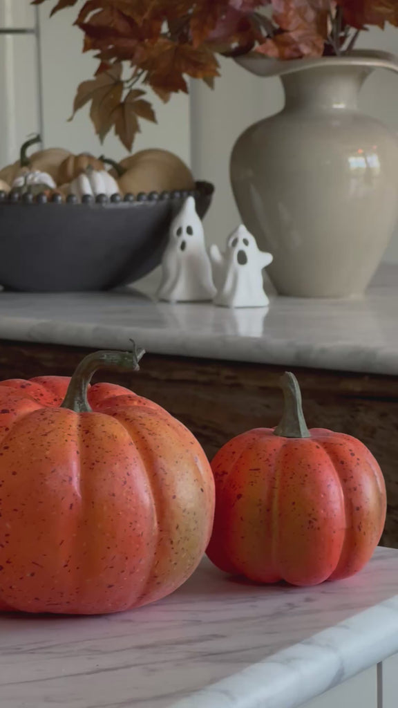 Add a warm autumn glow to your seasonal décor with the Charles Ted Rustic Orange Faux Pumpkins, available in small and medium sizes. Featuring a realistic speckled finish and curved stem, these decorative pumpkins capture the look of natural harvest pumpkins without the mess. Perfect for styling centrepieces, mantel displays, or wedding arrangements, these pumpkins bring a festive farmhouse touch to any space. A reusable and sustainable décor choice, they’ll be your go to fall decoration year after year.