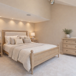 Complete your bedroom with the timeless Antoine Bed Frame, crafted from premium limewashed oak and oak veneer, paired with a soft upholstered headboard for added comfort. This elegant design combines classic French country styling with modern craftsmanship, featuring beautifully turned posts and a warm, weathered finish. The padded headboard, upholstered in a neutral fabric, creates a cosy backdrop for reading or relaxing in bed. Sturdy wooden slats provide excellent mattress support, ensuring both durability and style. Perfect for farmhouse, coastal, or traditional interiors, the Antoine Bed transforms your bedroom into a refined retreat.