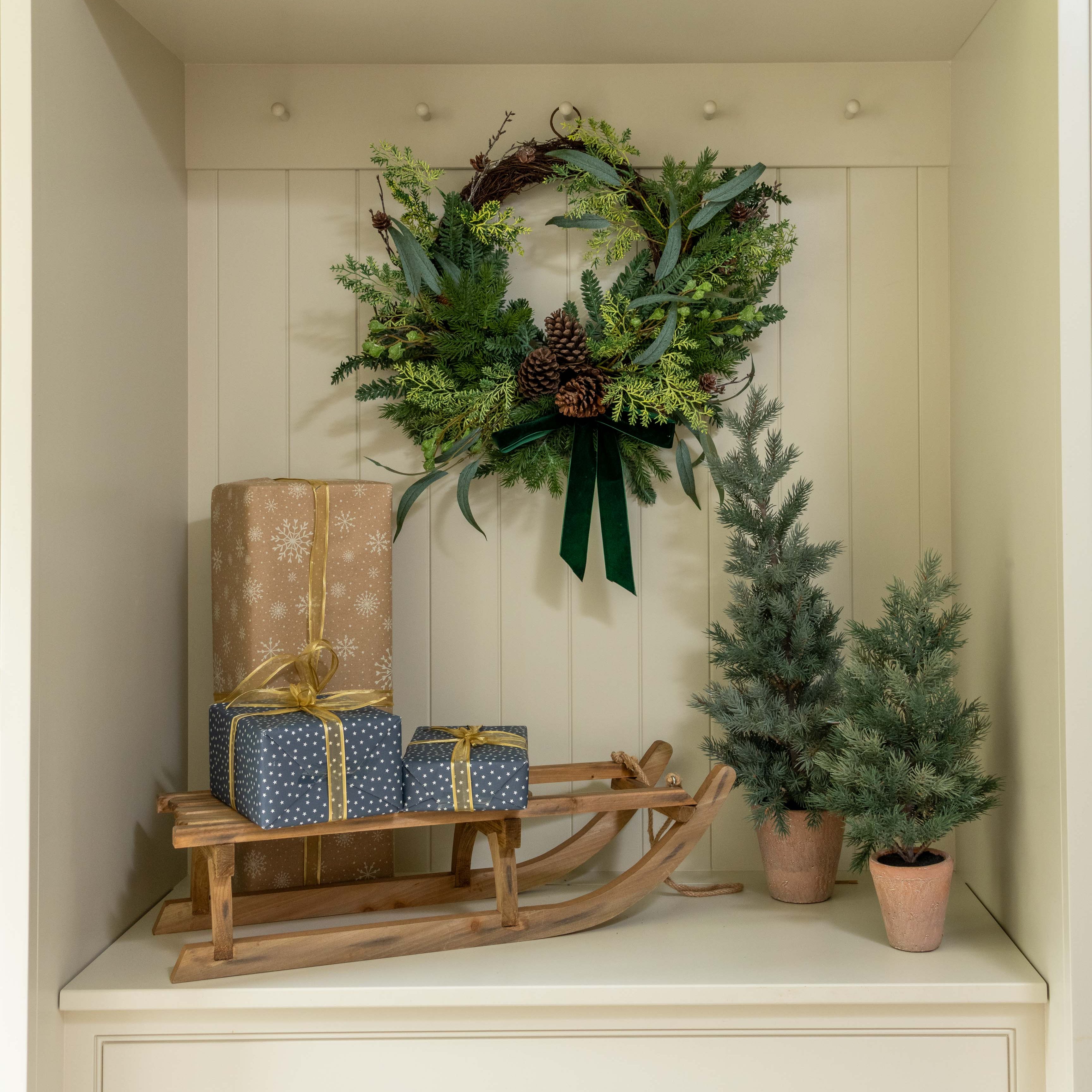 Celebrate the holidays in timeless style with the Evergreen Christmas Wreath with Green Velvet Bow. Designed with lush faux greenery, natural pinecones, and an elegant velvet ribbon in deep green, this wreath brings a festive and inviting look to your home. Its classic circular design symbolises warmth and togetherness, making it a perfect addition to your holiday traditions.