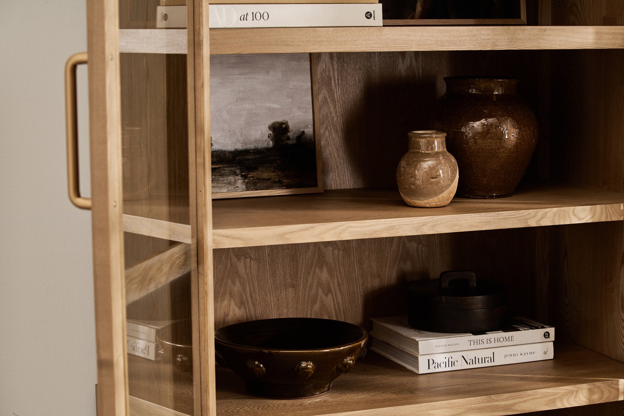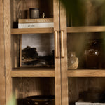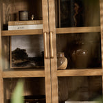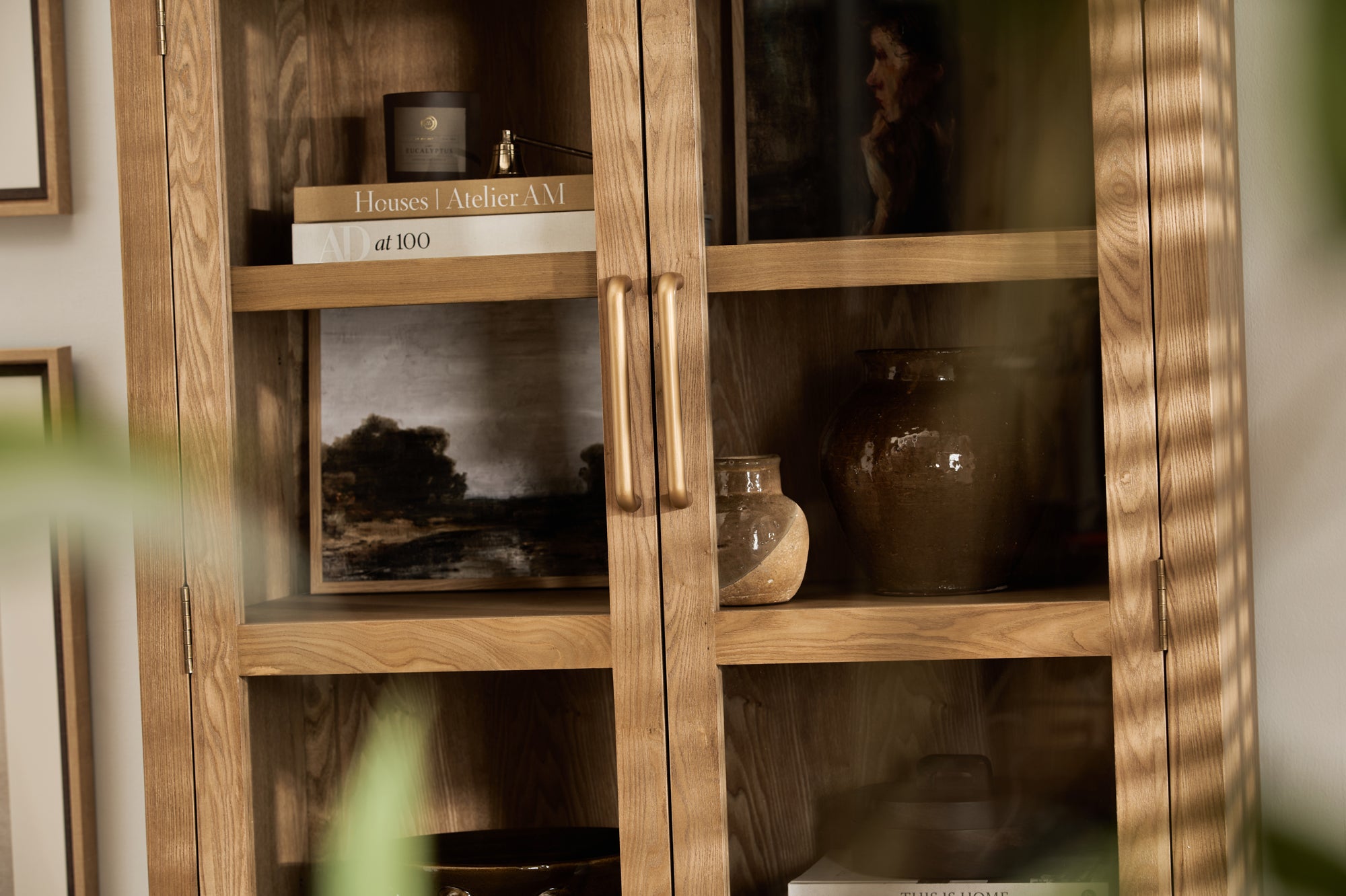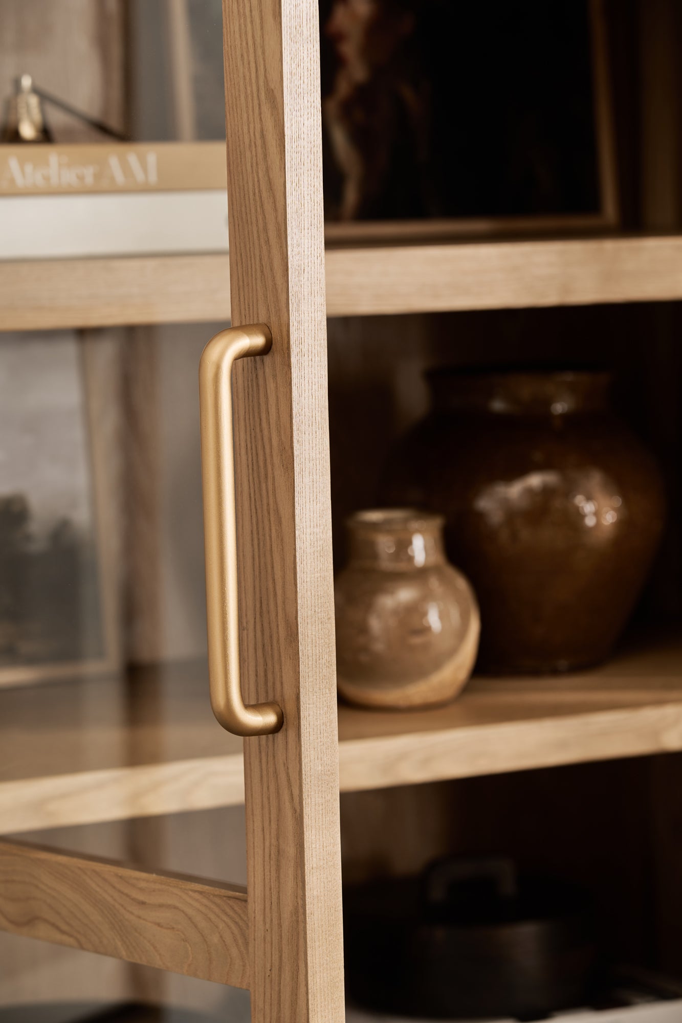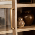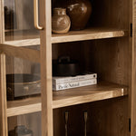 Built for both style and durability, this elm wood display unit combines functional storage with refined aesthetics. The tall legs and brass-toned handles offer a sleek, contemporary feel, while the clear glass doors keep your items visible and dust-free.