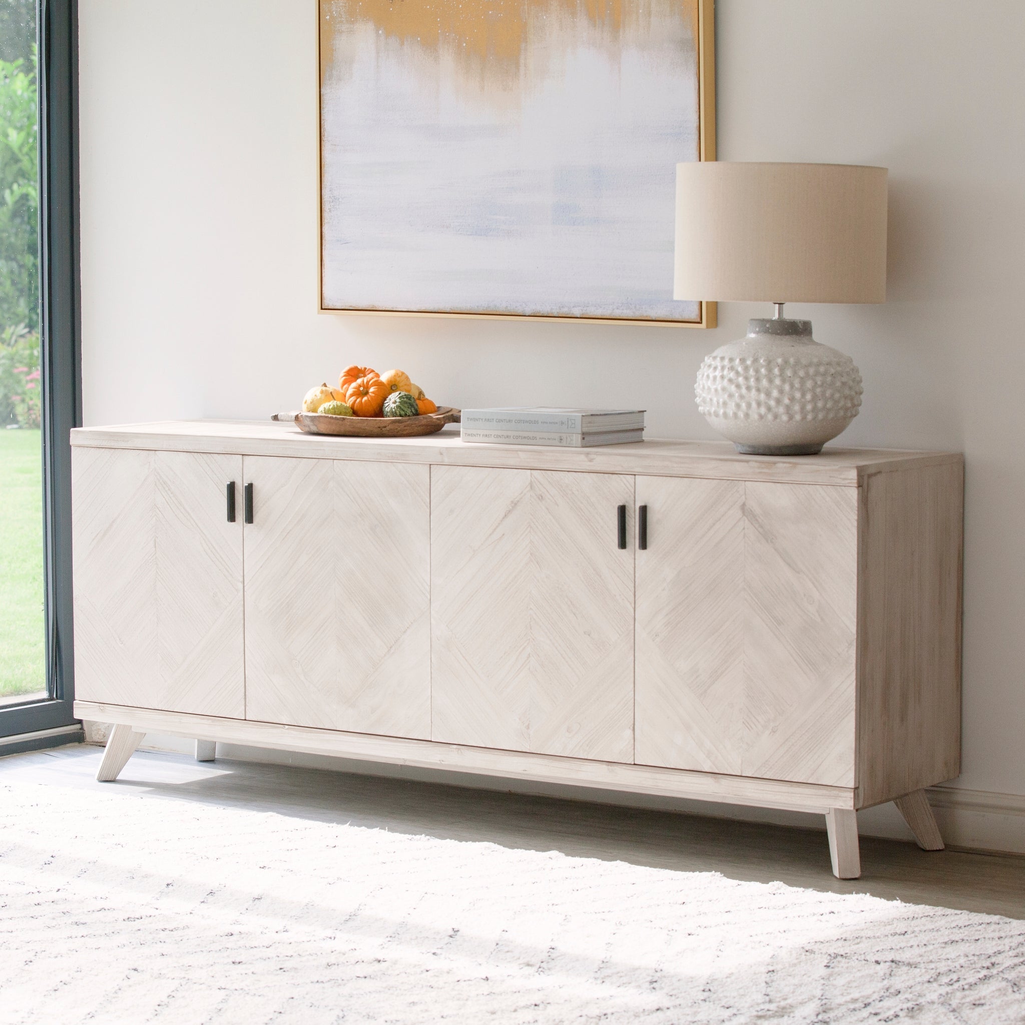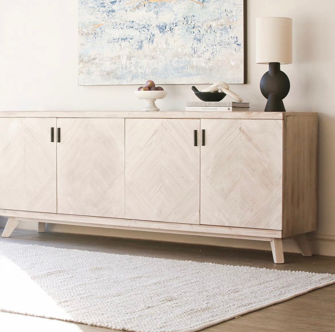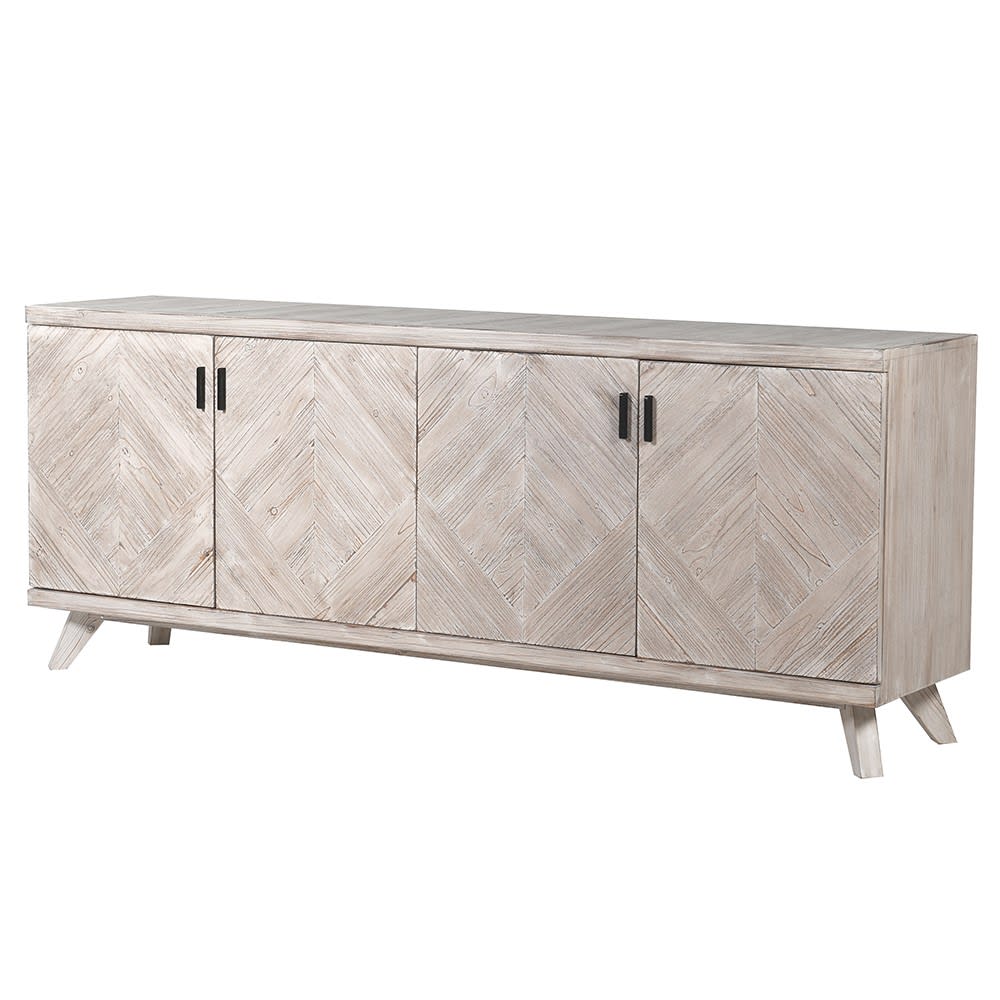 Most sideboards are defined by their scale and their storage. The Whitewashed Parquet Sideboard is defined by its doors. Four hand-laid chevron parquet panels in solid fir, finished in a soft natural whitewash that enhances the wood grain without overpowering it — the kind of artisanal surface detail that takes a storage piece into the territory of genuine furniture. At 200cm wide with four cupboards behind those parquet doors, the practical storage case is equally strong. But it is the doors that make this a piece worth choosing over every plain-fronted alternative at this scale.