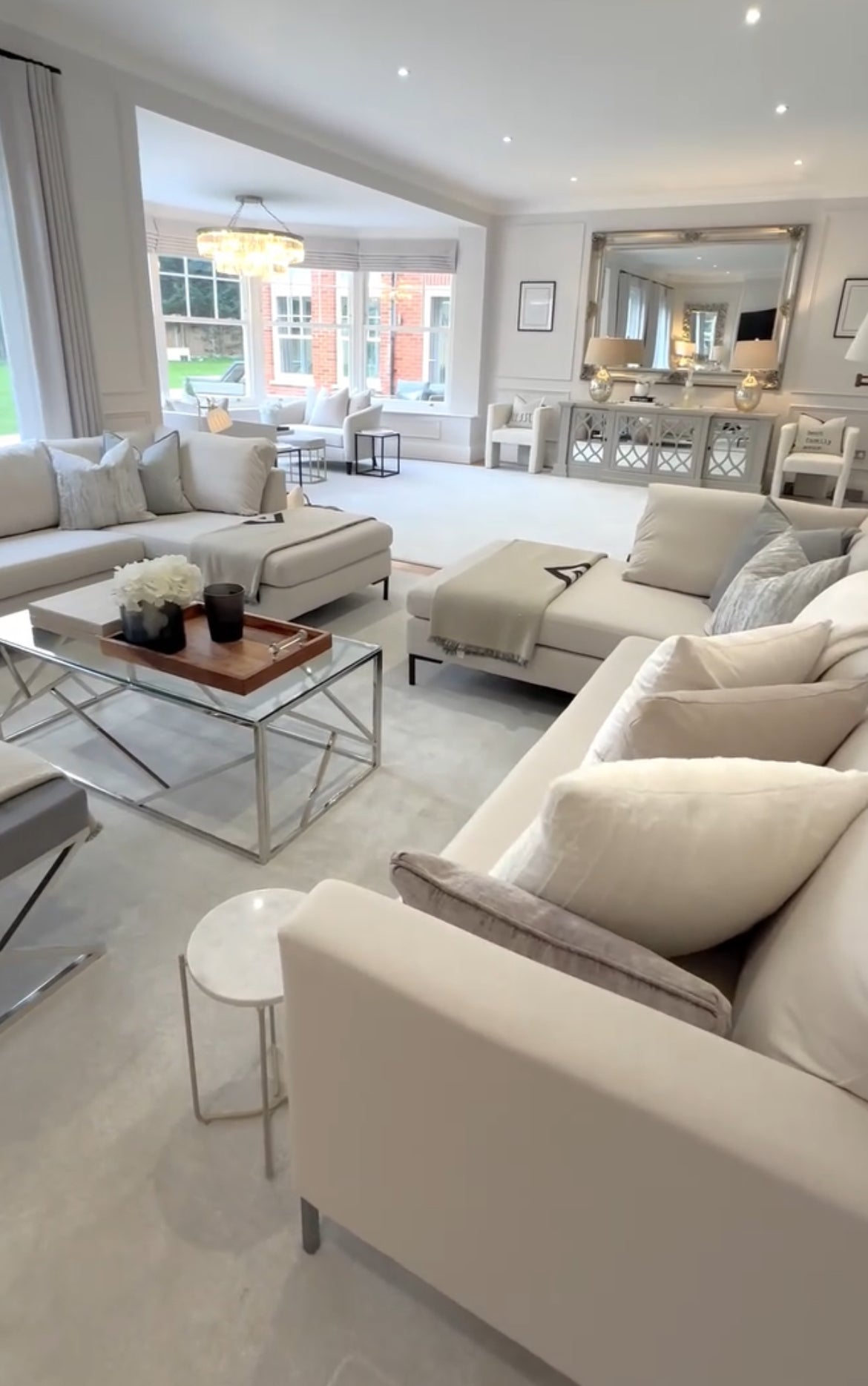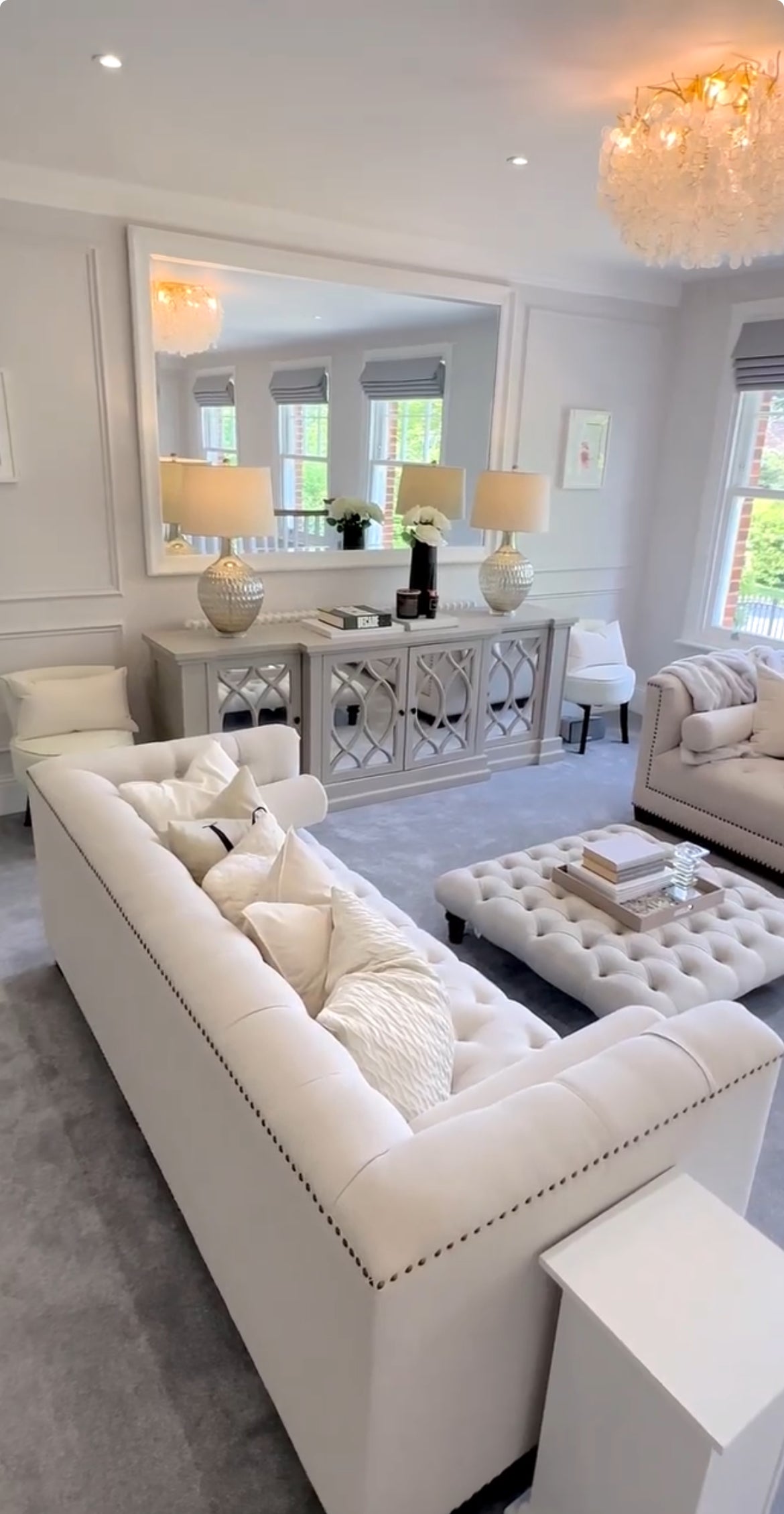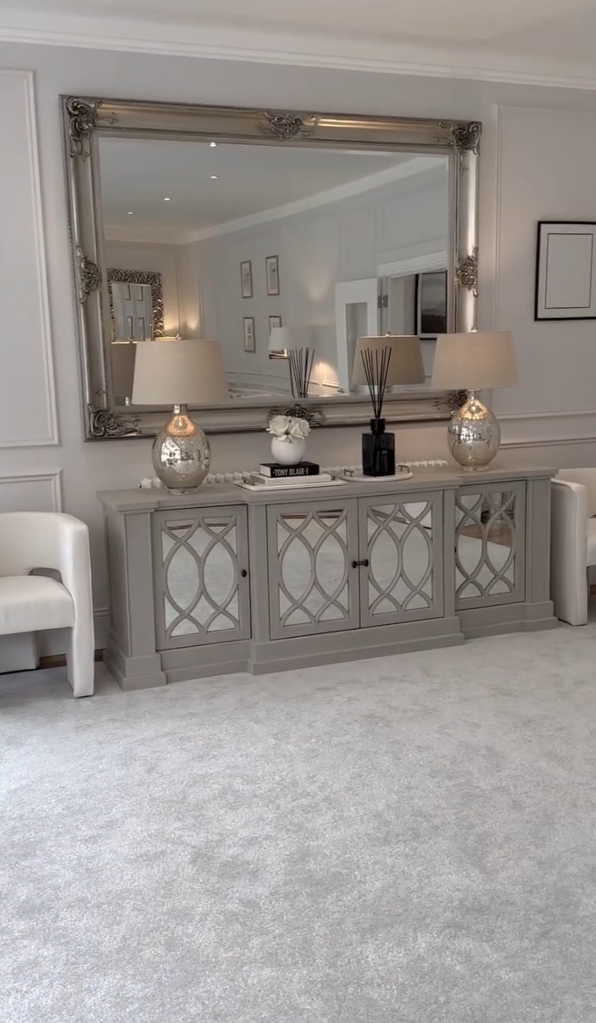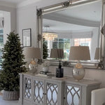 The mirrored doors feature intricate overlaid lattice detailing, reflecting light beautifully to enhance your space’s ambiance. Inside, generous shelving provides ample storage for dinnerware, glassware, or everyday essentials. Whether used as a dining room buffet, living room console, or hallway statement piece, The Erin Sideboard adds refined style and functional beauty to any interior.